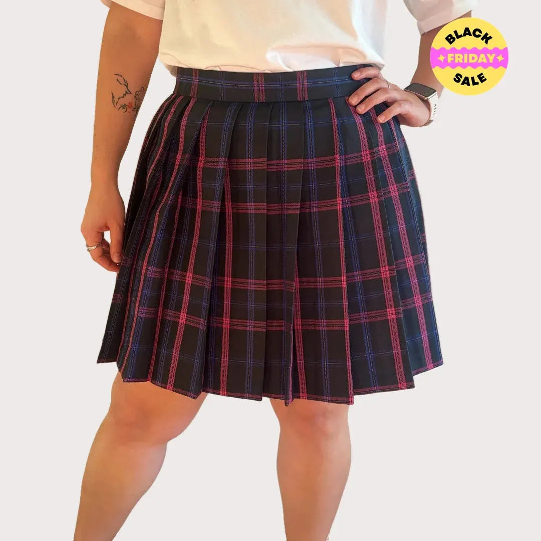 Whether you’re rocking it with sneakers, boots, or thigh-high socks, this pleated tartan skirt will become your new go-to for effortlessly cute and edgy looks.