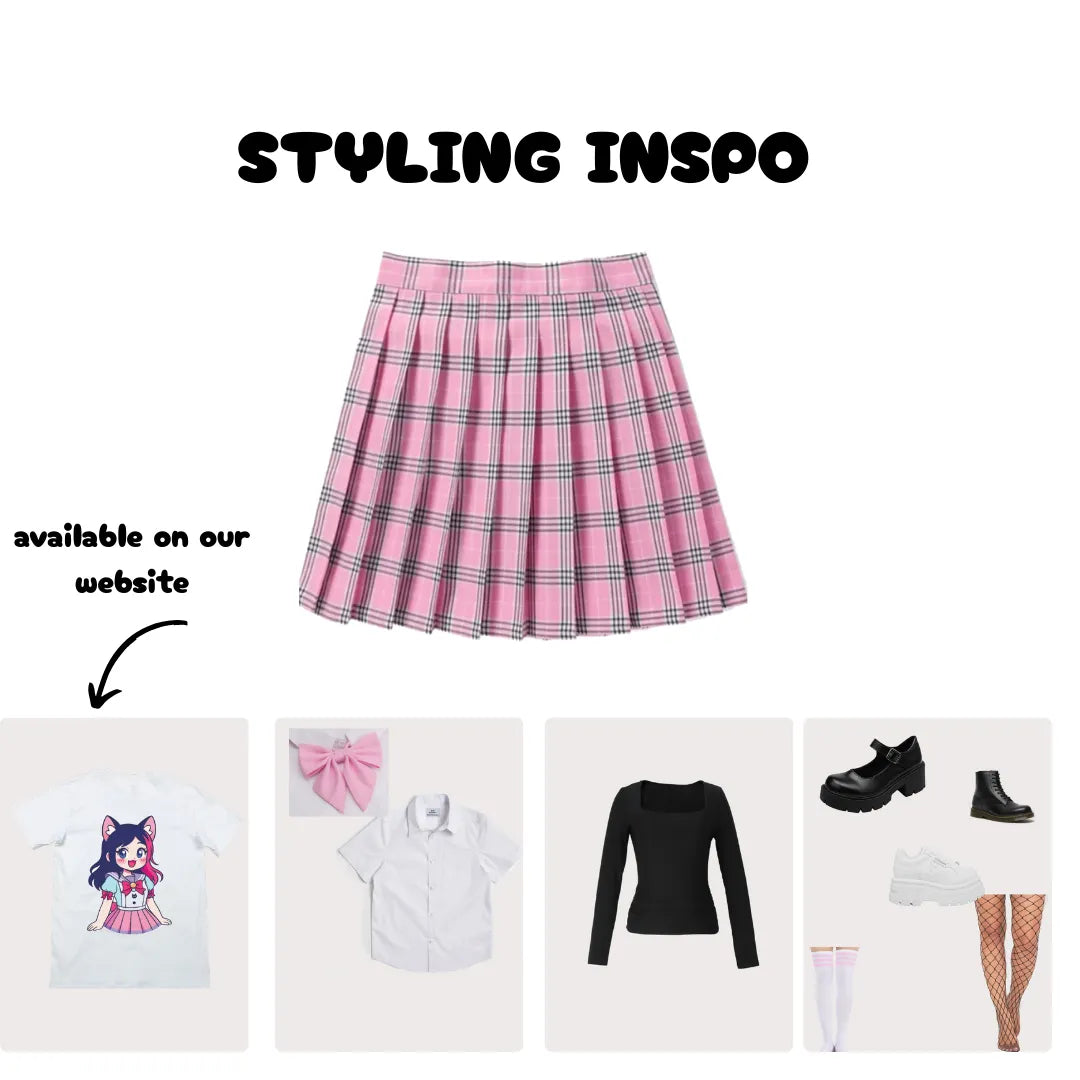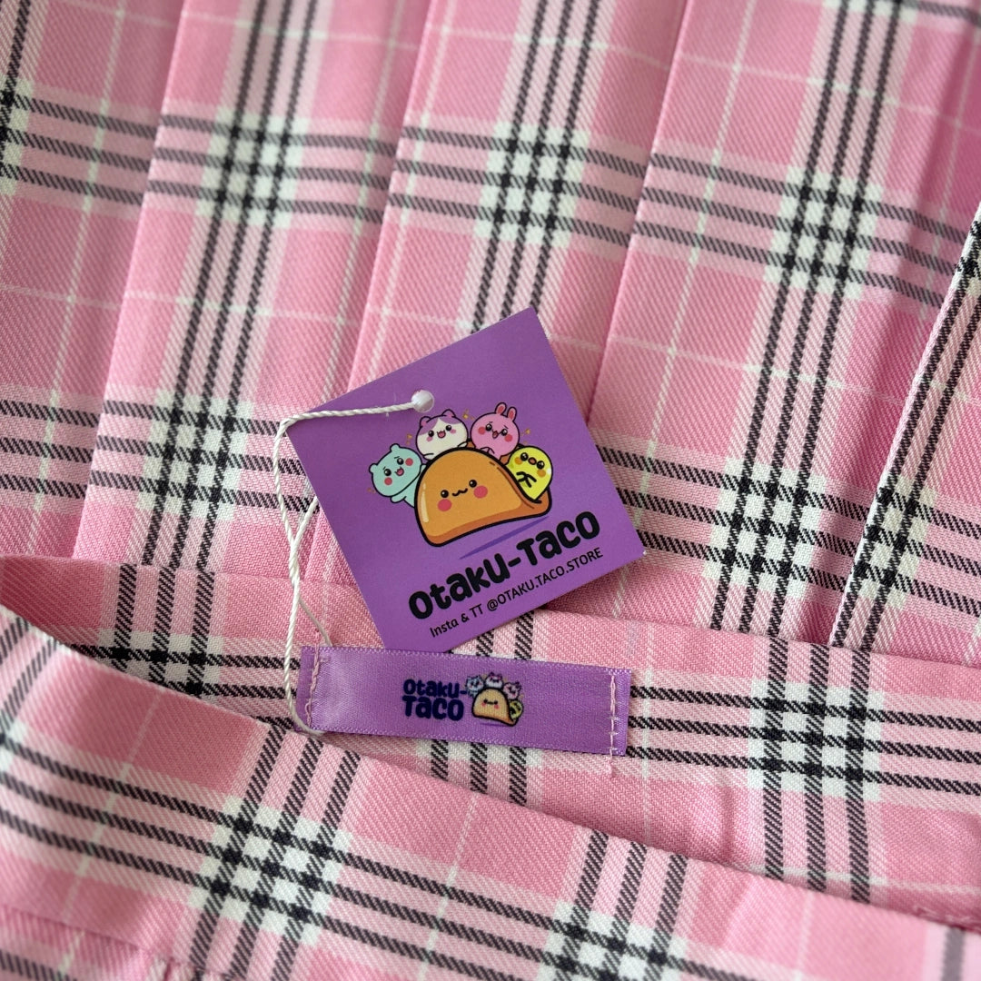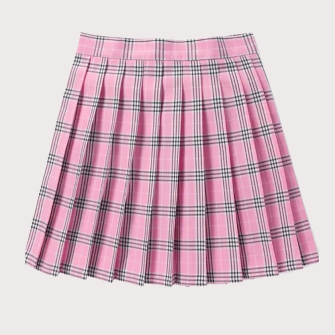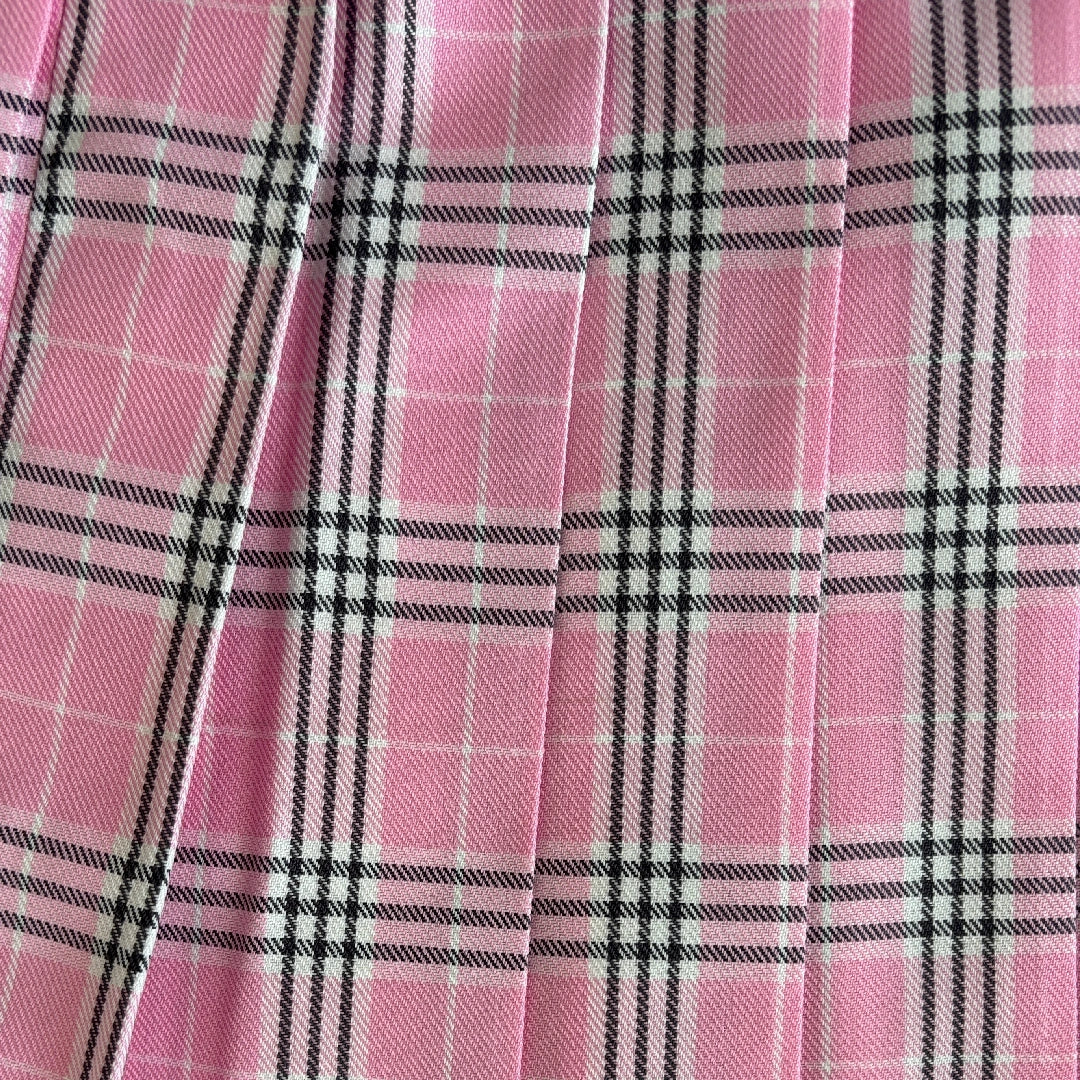 Featuring a pink and black plaid pattern, it brings a playful yet wearable vibe to any outfit. The classic pleats create a flattering silhouette that moves with you and adds instant charm to your look.